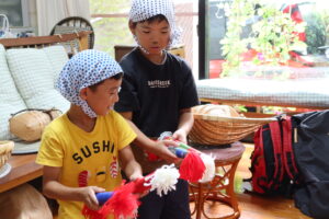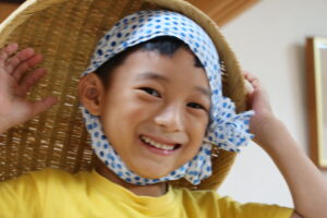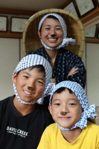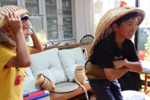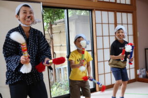 生徒さんが夏休み中のお子さんを連れてきたので、踊りの腰振りや銭太鼓をやって一緒に遊びました。