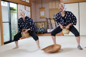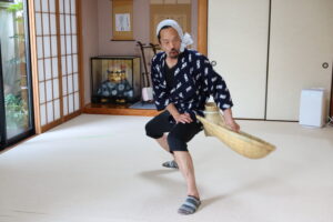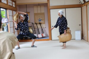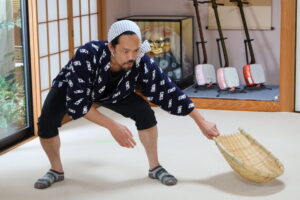 どじょうすくいは3番までありますが、逃げたどじょうを捕まえビクに入れてにこーっと笑う2番を体験。