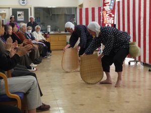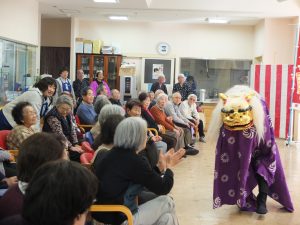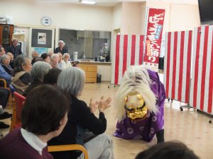 お正月の話をした後昔懐かしい獅子舞いが登場。目の前で観られて皆さん大喜びでした。