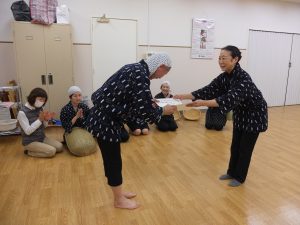 安来節保存会の資格審査を受けた生徒さん、皆受かりました。3級の技倆証を受け取っているのはカルチャーの亀井さんです。