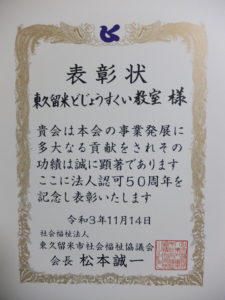 令和3年11月14日 長年にわたるボランティア活動の功績により、東久留米市社会福祉協議会 から2回目の表彰状を賜りました。皆様に喜んでいただけることが、私たちの喜びです。