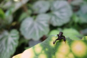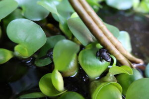 5月中旬、睡蓮鉢の中のおたまじゃくしが一斉に蛙になりました。体長まだ1㎝。立派な蛙になるにはまだ何年もかかります。